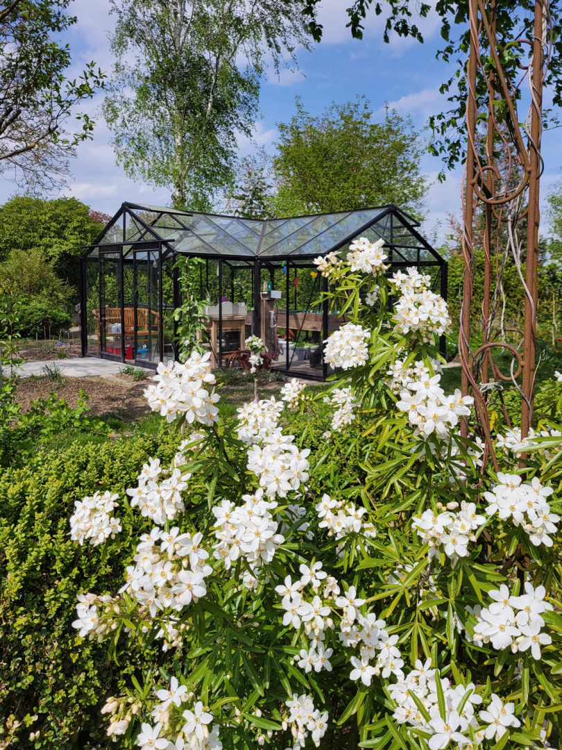 Cette Orangerie est une excellente pièce à vivre en extérieur grâce à son laquage noir et le charme irrésistible de sa structure en « T ». C’est une serre de jardin qui peut tout à fait servir de jardin potager ou pour hiverner mes plantes.